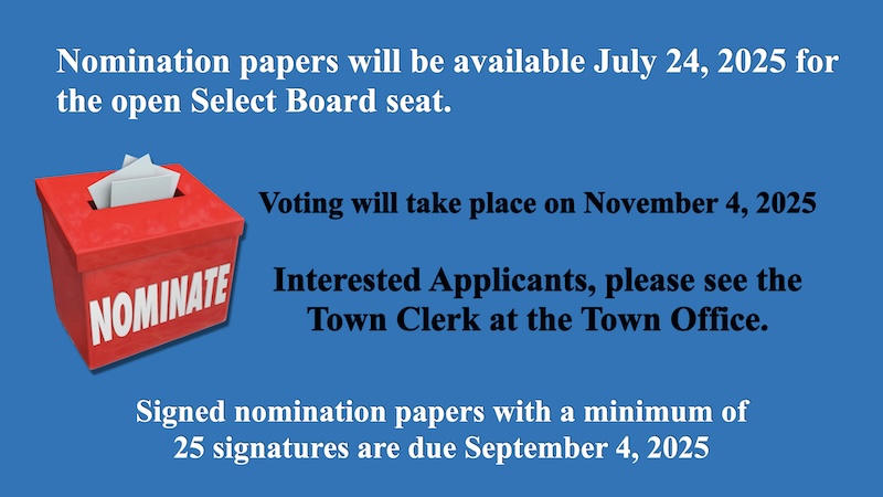 Nomination Papers will be available July 24, 2025 for the open Select Board Seat